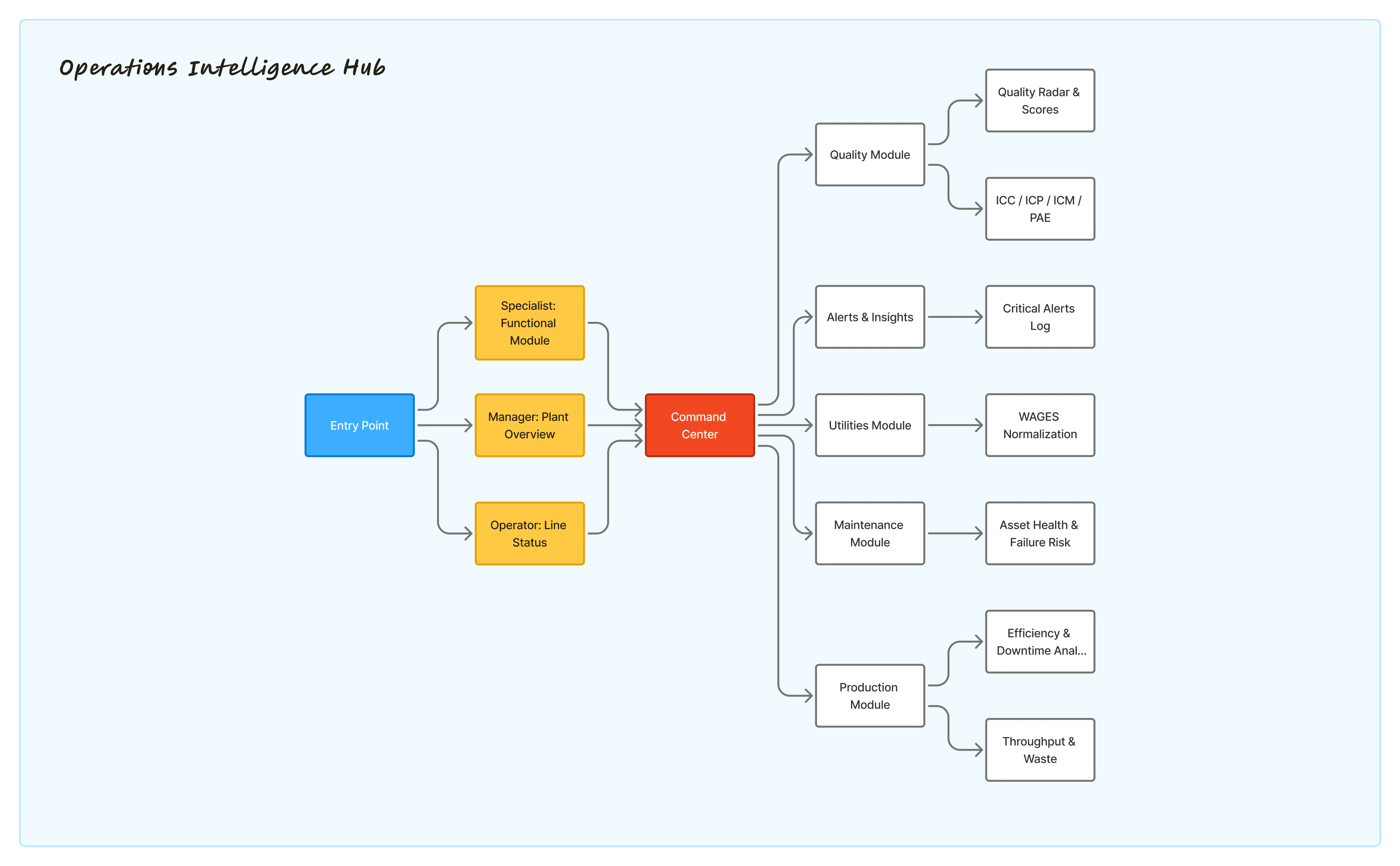 The resulting IA follows a progressive, hierarchical model, allowing users to move seamlessly from high-level awareness to detailed root-cause analysis. Each level was intentionally designed to reduce cognitive load, preserve context, and align with how manufacturing teams actually think and operate.