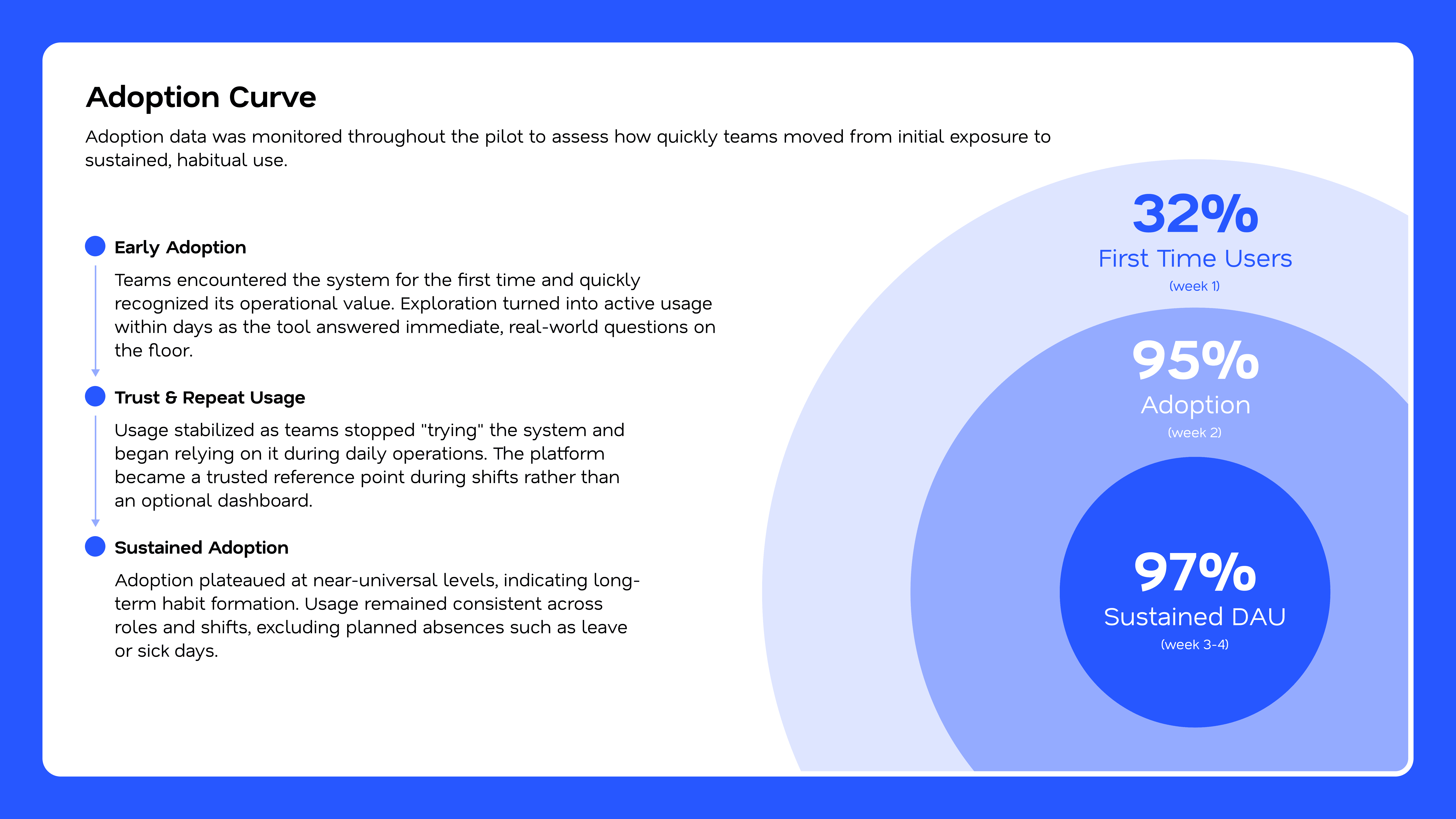 This wasn’t a problem that could be solved from a desk. While I wasn’t physically embedded at the plant, I led the research direction and synthesis, working closely with on-site consultants who conducted contextual inquiry across shifts. I guided what to observe, what questions to ask, and how insights should be captured, then translated those field findings into clear user needs, workflows, and design principles that informed the product end to end.